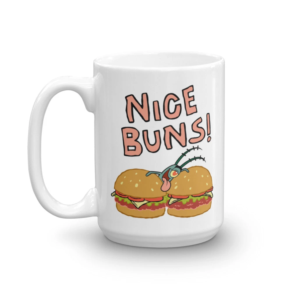 Is there anything better than having nice buns? Plankton’s pride and joy may be the Chum Bucket, but even he can’t deny the deliciousness of Krabby Patties! Enjoy your favorite hot or cold beverage in this Chum Bucket Nice Buns White Mug to represent Bikini Bottom’s small-but-mighty villain.
