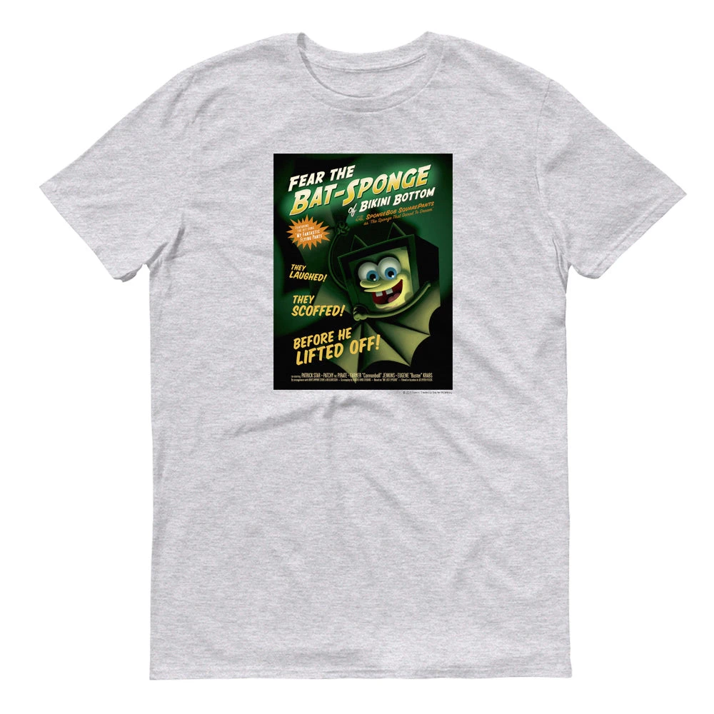 Bikini Bottom Beware: the Bat-Sponge is ready to take flight! Stylish, comfy, and oh-so spongy, this SpongeBob Fear The Bat-Sponge Short Sleeve T-Shirt is perfect to wear all around the deep blue sea.Â