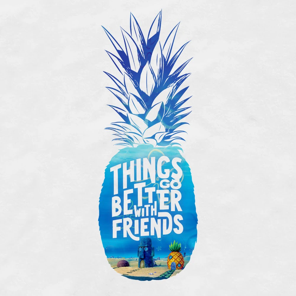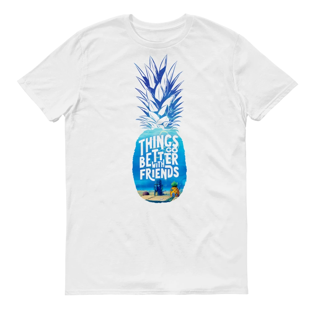 Featuring SpongeBob, Patrick, and Squidward’s homes within a pineapple design, this Sponge on the Run Better With Friends Pineapple Silhouette Adult Short Sleeve T-Shirt lets everyone know that life is always better with friends. Wear this comfy tee while watching Sponge on the Run or while hanging out with your best pals for ultimate style!