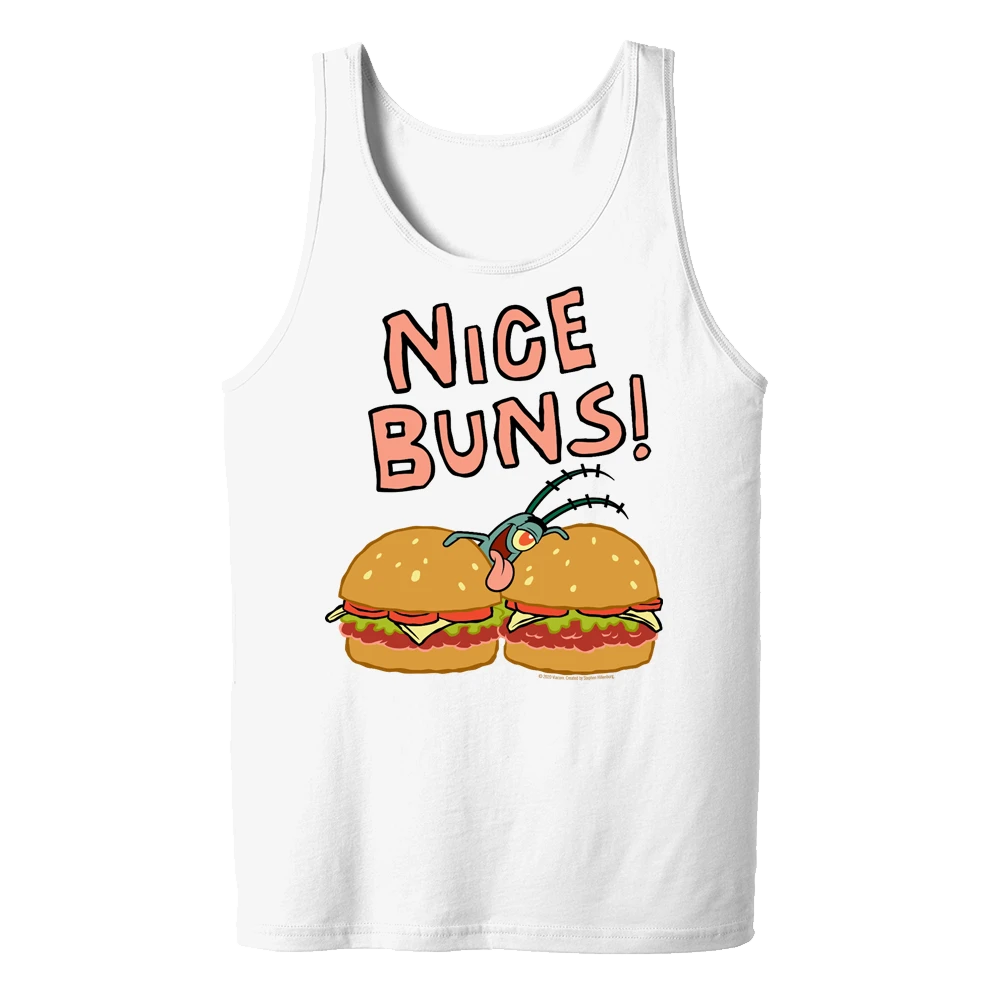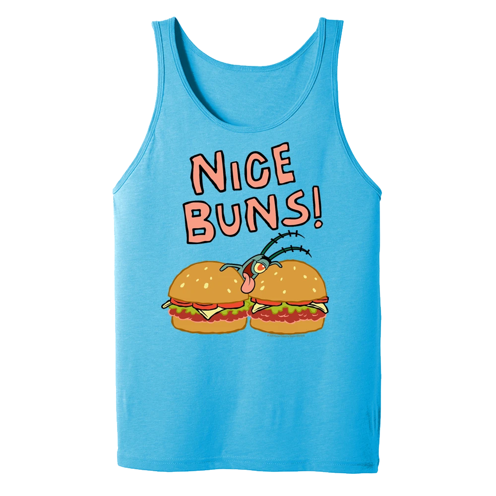 Sun’s out, buns out! Available in multiple colors and featuring Plankton hugging a pair of Krabby Patty buns, this Chum Bucket Nice Buns Unisex Tank Top is a great addition to your warm-weather apparel. Whether you wear this tank top to Larry’s Gym or to the Goo Lagoon, everyone will know that you appreciate a good pair of buns each time you wear it.