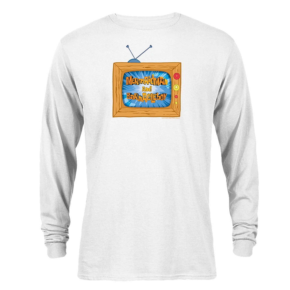 This SpongeBob SquarePants Mermaidman and Barnacleboy TV Long Sleeve T-Shirt lets everyone on land and under the sea know who your favorite crime-fighting duo is. Featuring Mermaidman and Barnacleboy’s names on a TV, this long-sleeve tee is a must-have addition to your wardrobe.