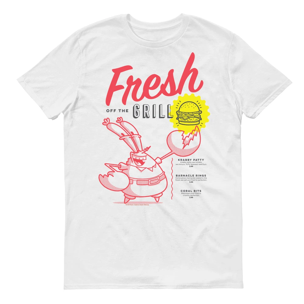 Fresh off the (style) grill, this comfy The Krusty Krab Mr. Krabs Fresh Off the Grill Adult Short Sleeve T-Shirt will give your wardrobe one whale of an upgrade! With Mr. Krabs holding a delicious Krabby Patty in his claw, this tee is perfect for those who love the Krusty Krab.