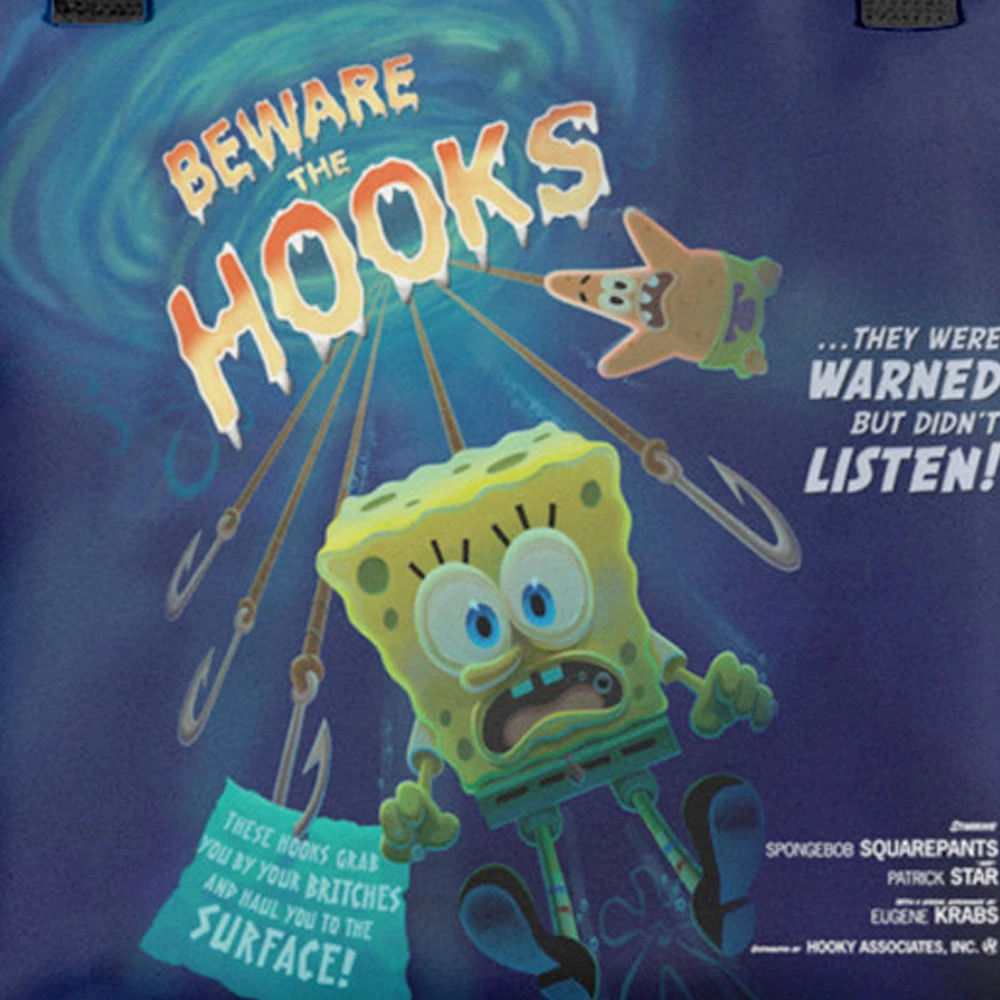 Beware the hooks! This SpongeBob Beware The Hooks Tote Bag will have you looking over your shoulder for those hooks all season long. With a classic movie poster design and plenty of room for your daily essentials, this tote bag will quickly become your favorite accessory!