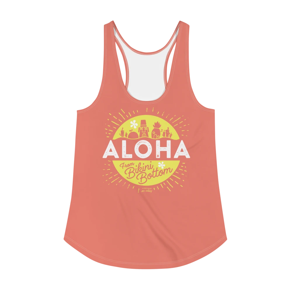 Aloha from Bikini Bottom! From the Krusty Krab to the sprawling hills of Jellyfish Fields, this SpongeBob SquarePants Aloha Women’s All-Over Print Racerback Tank Top lets you represent your favorite parts of this undersea paradise in style.