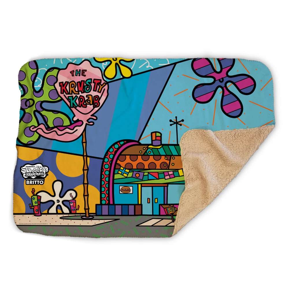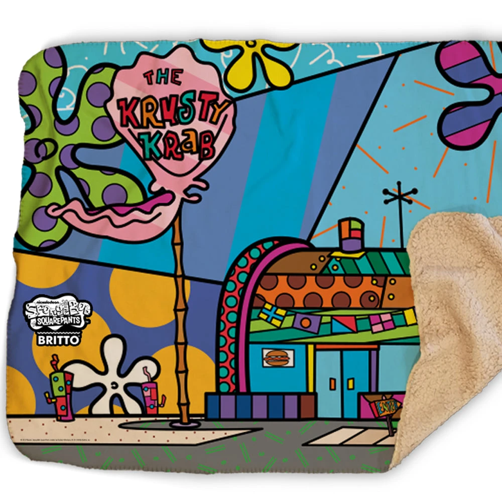 Comfy, colorful, and oh-so Krabby, this SpongeBob SquarePants Britto The Krusty Krab Sherpa Blanket is perfect to snuggle up in after a long day of serving up smiles. Featuring the vibrant artwork of Romero Britto, this sherpa lets you enjoy beautiful designs and Bikini Bottom’s best restaurant each time you see it.