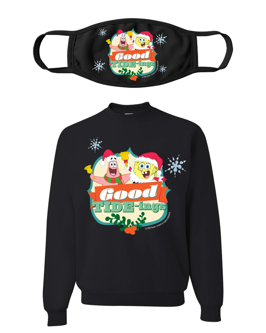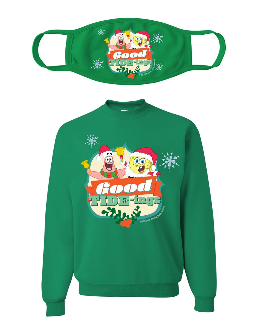 Bundle & save! Take on the Holidays this year safely and stylishly wearing this exclusive SpongeBob “Good Tide-Ings” Crew Neck Sweatshirt and Face Mask. This exclusive Holiday bundle is the perfect gift for any SpongeBob fan! It includes a soft Crew Neck Sweatshirt and a matching face mask to wear to Holiday gatherings, available in two festive colors!